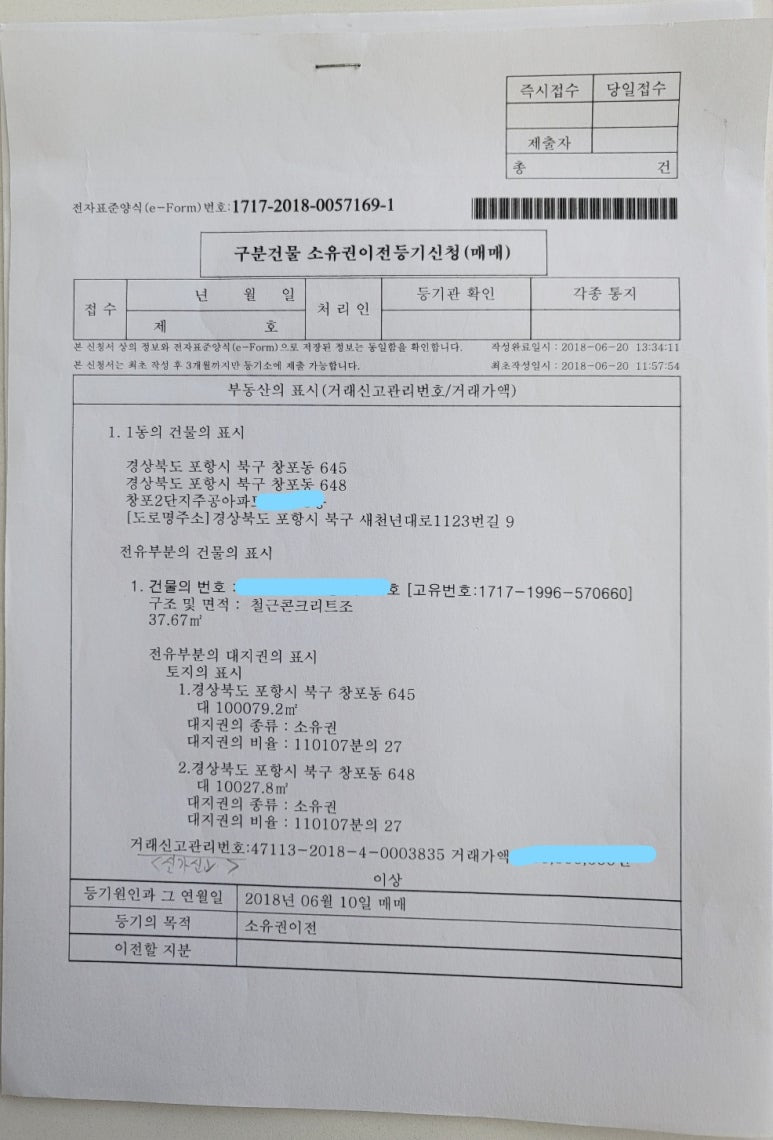- 소유권 이전등기신청서(e-form 인터넷등기소에서 작성후 출력)