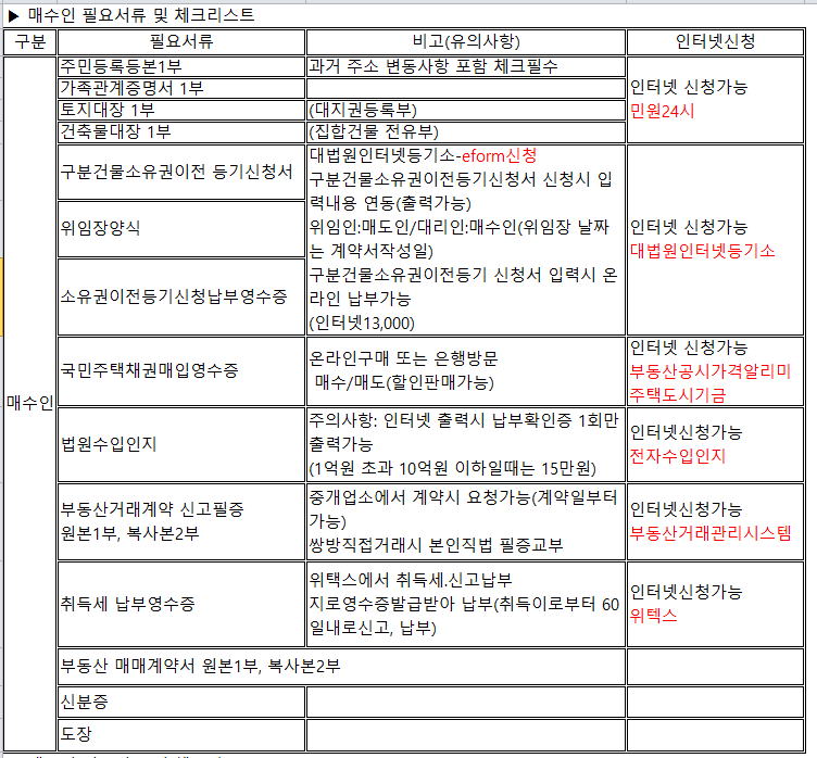 - -등기권리증 원본-매도용 인감증명서 1부(매수자 주소, 성명, 주빈번호 기재)