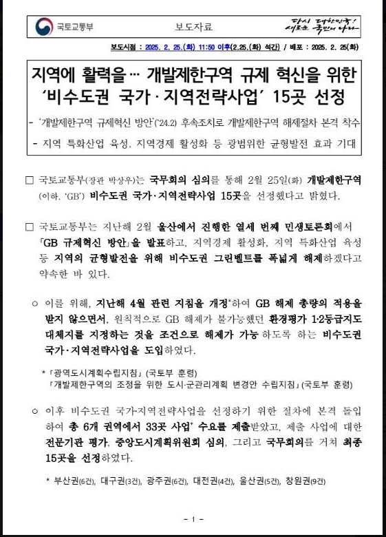 이번 비수도권 15곳 개발제한구역 해제 및 국가 지역전략사업 선정은 지역 경제 활성화와 산업 경쟁력 강화의 중요한 전환점이 될 것입니다.