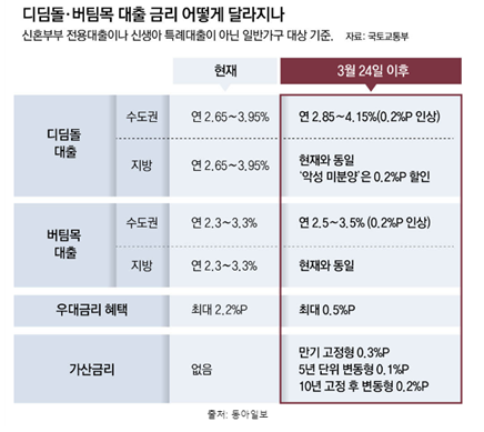 정부는 최근 금리 변동을 반영하여 디딤돌 대출은 0.2% 인상, 버팀목 대출은 2.5% 수준으로 조정한다고 발표했습니다. 이에 따라 대출을 준비 중인 신혼부부들은 금리 변화를 고려하여 대출 실행 시기를 조율하는 것이 중요합니다.