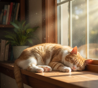 Prompt : 햇살이 비치는 나무 창틀 위에서 낮잠을 자는 줄무늬 고양이, 빛에 흩날리는 먼지, 영화 같은 조명, 고화질 상세 묘사.