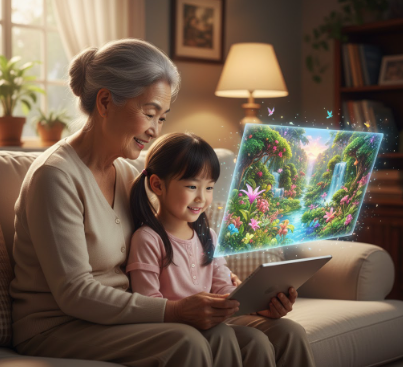 Prompt: 태블릿 PC를 함께 보고 있는 어르신과 아이, 화면 위로 홀로그램처럼 나타난 아름다운 AI 생성 정원, 따뜻한 실내 조명, 마음이 따뜻해지는 분위기.