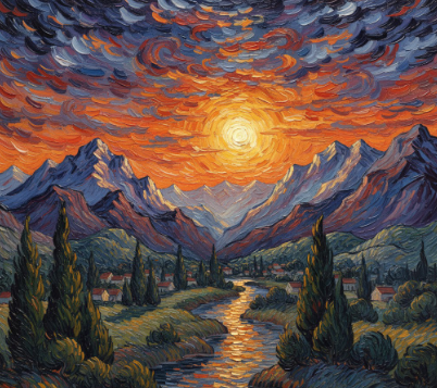 Prompt: 노을 지는 웅장한 산의 풍경, 소용돌이치는 두꺼운 유화 질감과 생생한 주황색 및 보라색을 사용한 빈센트 반 고흐 스타일.